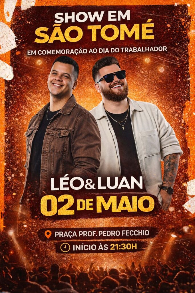 Já no dia 2 de maio, sábado, a comemoração continua com show ao vivo da dupla Léo e Luan, na Praça Pedro Fecchio. A apresentação deve começar por volta das 21h30, reunindo moradores e visitantes em uma noite de música, alegria e confraternização.